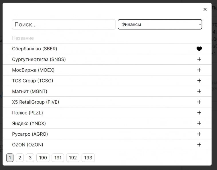Над этим списком было бы удобно выбирать тип инструмента: акции, облигации. Сейчас пишешь «Газпром» и потом нужно просмотреть несколько страниц в поисках акции (т.к. первые листы занимают облигации Газпрома).