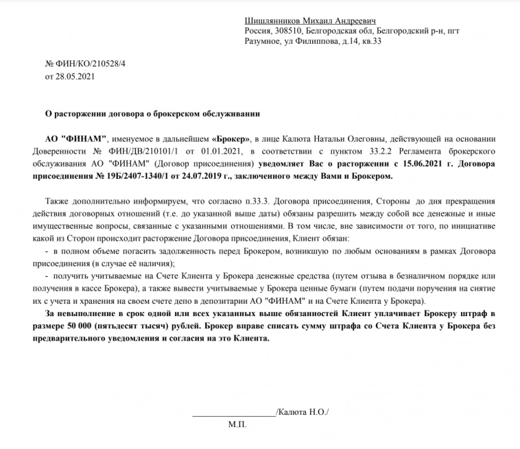В таком случае причин может быть огромное множество, сразу скажу. Так или иначе, ФИНАМ, в роли комиссионера, несёт ответственность за исполнение клиентских поручений не только перед клиентом, но и Банком России. Если брокер что-то усмотрел или заподозрил, то они с большей вероятностью тупо обрубят все концы. Тут остаётся только гадать, грубо говоря. Стороны действительно могут спокойно расторгнуть договор, ничего не поясняя (хотя этика гласит, что при направлении уведомления о расторжении, всё же нужно давать отсылку на причину расторжения).