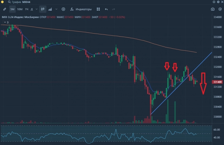 14.03.2024. Вчера индекс ММВБ закрыл день красной свечкой. Рынок обновил свои локальные хаи, но снова не пройдя локальных сопротивлений (на утро — кластерная зона 3355-3370) поехал в очередную коррекцию, где на вечёрке даже смог пробить локальную поддержку (на утро — 3321), закрывшись ниже. Коррекция пока не выходит за рамки обычной в этом импульсе (от 21.02), однако появляющаяся перед локальными сопротивлениями слабость рынка вкупе с пробоем локальной поддержки должны слегка напрячь ибо растёт вероятность окончания импульса от 21.02 и разворота рынка в большую 4 волну.