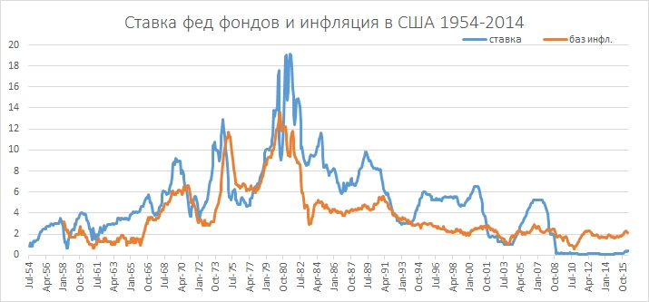 Вы, видимо, плохо изучали макроэкономику. Хрестоматийный пример двукратного отличия ставки и инфляции — США 80х годов, эпоха Великого Пола Волкера. Придя на пост главы ФРС после стремительного обесценивания доллара в 1970х, он нещадно давил инфляцию высокой ставкой. При инфляции в 5% запросто держали ставку 11%. И это, как видите на графике, прекрасно работало, инфляцию сбили до вполне приемлемых значений.
