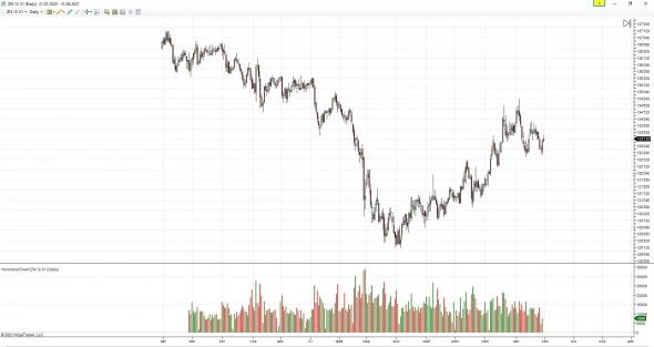 Цена спускается, спускается. Но объёмов нет и нет. При среднем объёме в 1000 контрактов, проходит 100-200-300 на каждом тике. Что это означает? Что заинтересованности в движении нет. Нет крупного игрока, который задаст движение.