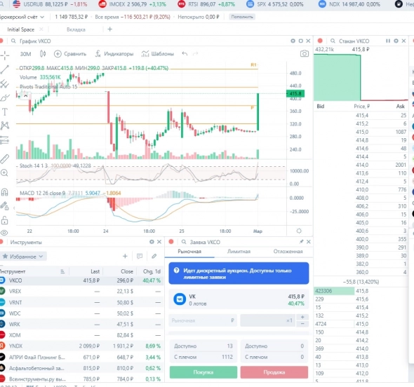📈VK+30.5% Первый день торгов гдр открыли невероятным ростом на 30%, на данный момент продавцов в стакане нет и есть желающие купить гдр на 282 млн. рублей.
