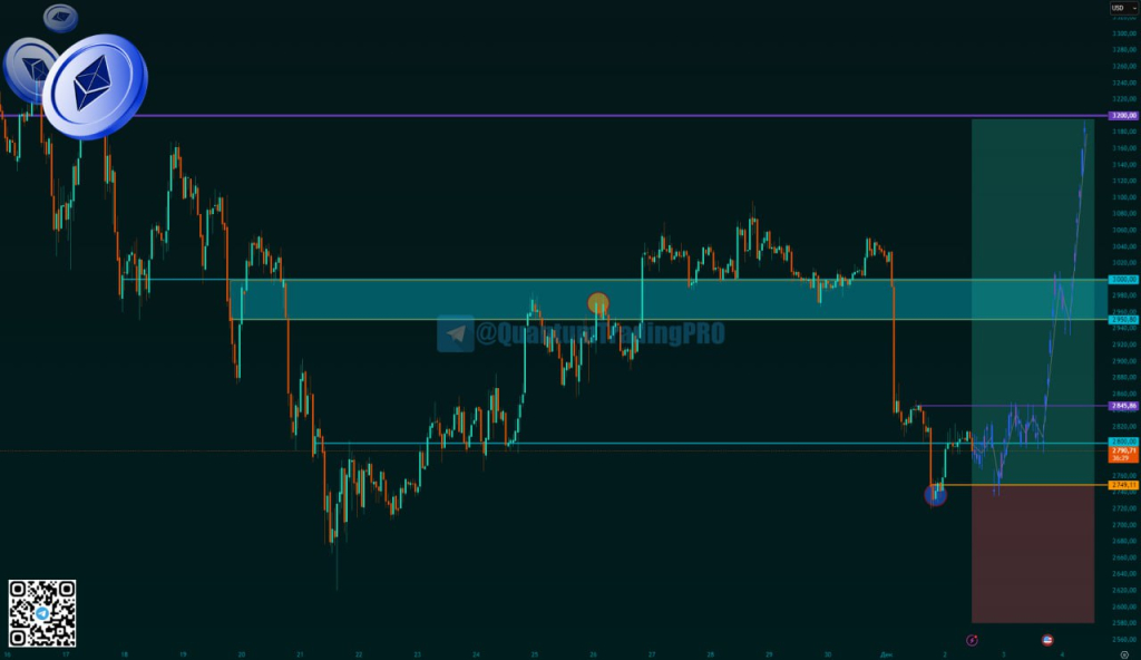 Про цели: Первой целью выступает уровень 3000, ключевое сопротивление, где фиксируем часть прибыли. Основной целью остаётся фундаментальное сопротивление 3200. При тесте данного уровня с высокой вероятностью мы увидим локальную нисходящую коррекцию для сбора ликвидности, но пока об этом рассуждать рано. Потенциал хороший, соотношение риска к прибыли удовлетворительное.