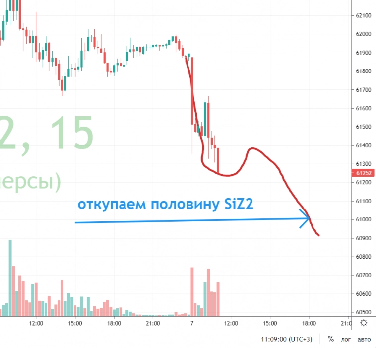 на открытии пытаемся продать дорого Сишку (но уровне спота с близким к 0 контанго/бэквордацией) — если получится, то ждем SiZ2 ниже 60500 или бэквордацию ниже (больше по модулю) -300 пп и откупаем Сишку или же просто переворачиваемся в Бэквордационный арбитраж с целью 0-50пп