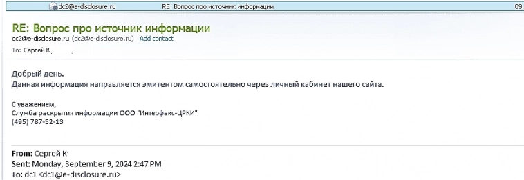 Мы получаем эту информацию или непосредственно от эмитента, или от Агентства-распростанителя, с которым у эмитента заключен договор на совершение действий по раскрытию информации (https://www.disclosure.ru/rus/events2/tu )