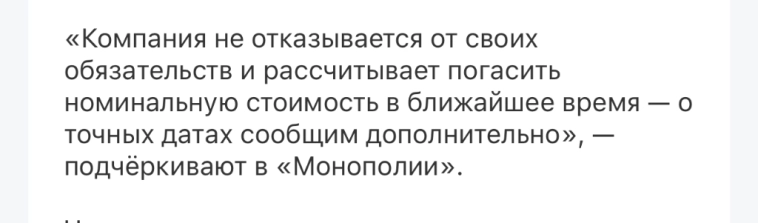 Андрей Иванов, думаю у монополии было 260млн. руб, просто решили не платить тк.3 ярда все равно не отдать.А так можно ещё банковать 3-6 меся...