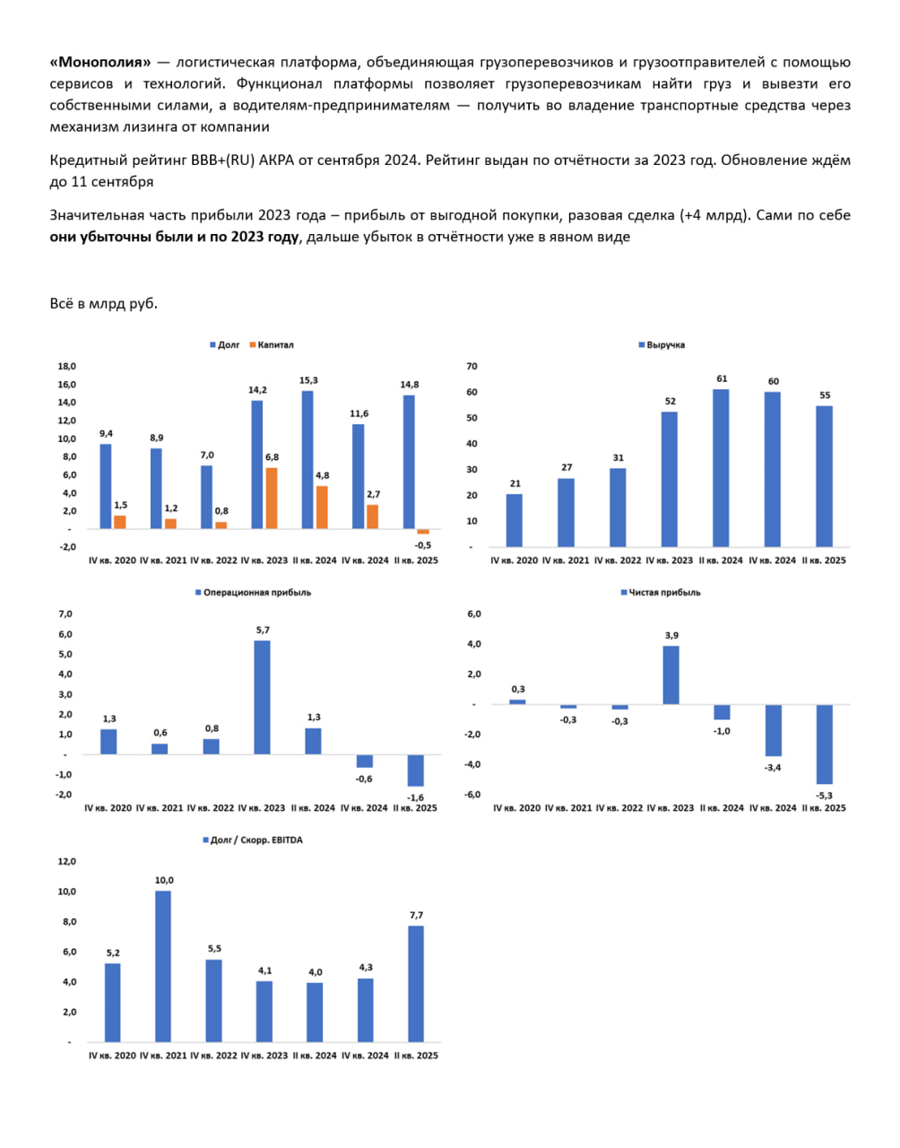 Складывая всё, как обычно, желаем эмитенту всяческих успехов, но не очень понимаем, как их достичь. Облигаций Монополии у нас не было, а если бы были, мы бы их продали. Без паники, постепенно. Нынешние доходности, 30-45%, создают некоторую устойчивость котировок для выхода в деньги.