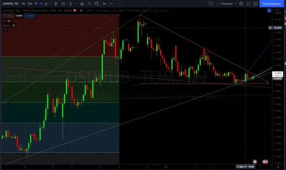 Российский рубль оттолкнулся от пробитого нисходящего канала, где также проходит аптренд и горизонтальная поддержка 73.35. Базовый сценарий при таких раскладах – рост котировок до первого потенциального уровня 75.30: