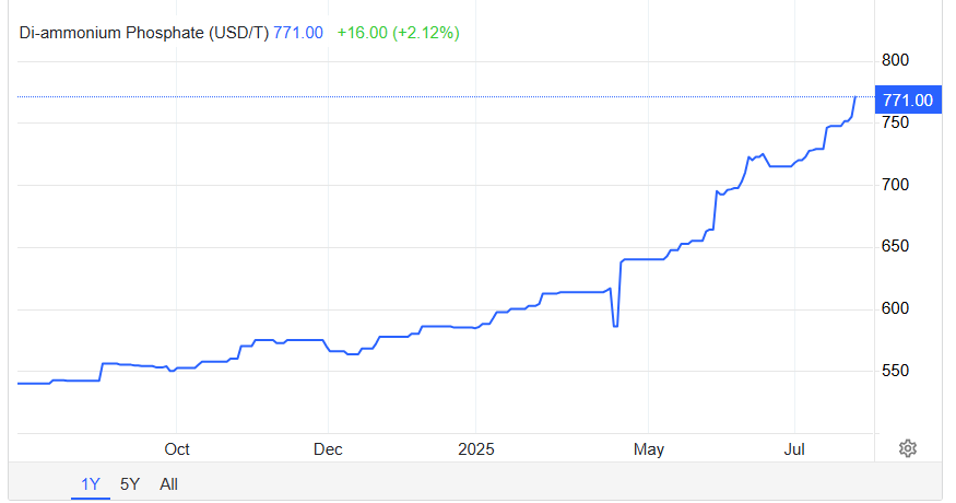 История с азотными удобрениями подтверждает риски ценового скачка: после введения ЕС пошлин на российский карбамид с 1 июля 2025 года его цена в мире выросла на 18%, достигнув $496 за тонну. Фосфорные и азотно-фосфорные удобрения также подорожали до $736 за тонну — максимумов с 2022 года.
