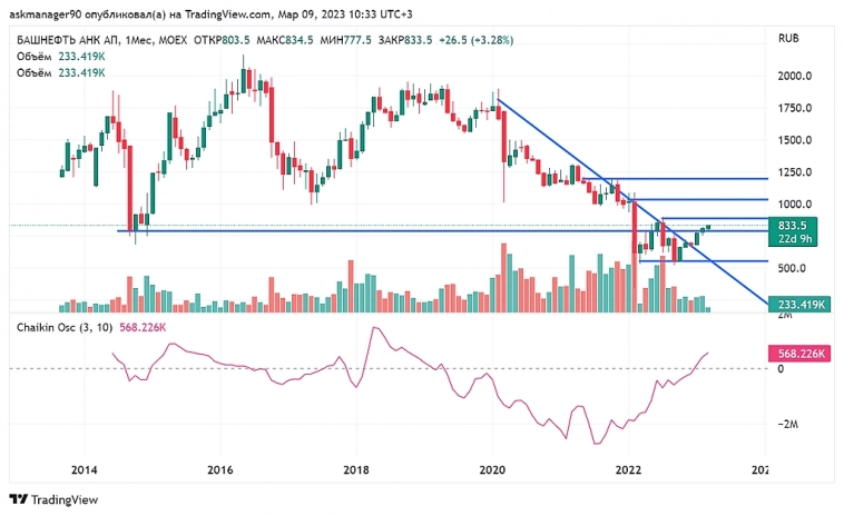 На 550 двойное дно. Линию нисходящего тренда пробили оттестировали и выше. Прошлый глобальный минимум на 800 пробили вверх. Осциллятор Чайкина показывает, что спрос на бумагу начал расти с середины 2021 года.