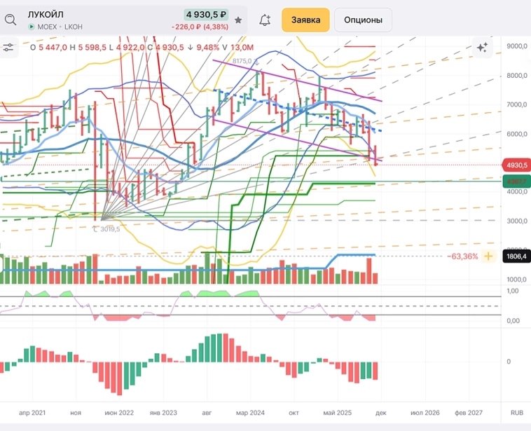 ◽️От иностранных властей поступает всё больше сигналов о том, что активы Лукойла могут быть национализированы. В таком случае считаю, что моя давняя цель в 4750₽ будет достигнута в любом случае, а в перспективе можем дойти и до 200 EMA (≈4200₽) — от этого уровня Лукойл уже разворачивался в феврале 2022 года.