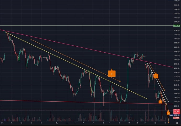 На дневном графике цена дошла до своей сильной поддержки в виде горизонтали 259200 и пробует от нее отскочить и пока цена выше этого уровня, рост может возобновиться. Пробой 259200 даст сигнал на продолжение снижения