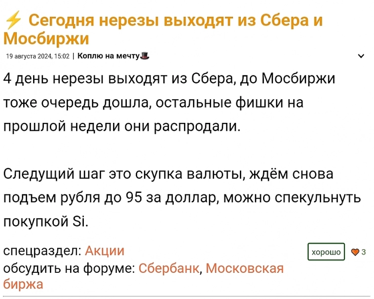 Для меня акции Сбера это бумажка которую в данный момент рынка оценивают в 269 рублей, но по моим расчетам завтра-послезавтра будут оценивать в моменте в 275 рублей. Поэтому я планирую дождаться того момента и сбыть ее людям, которые поверят, что в следующем моменте они смогут продать ее еще дороже, ну или тем, кто будет крыть шорты.