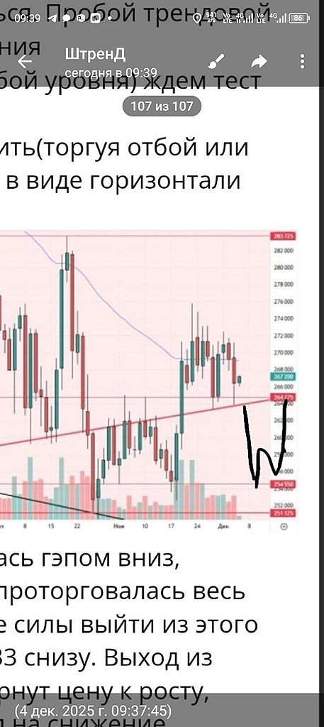 Для сделки (торгуем отбой или пробой уровня) ждем тест трендовой 263850