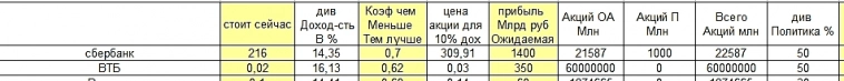 Дмитрий Первый, снова тебе свою табличку покажу. тот кусок где про сбер и ВТБ. Коэф привлекательности к покупке у сбера был 0,7, а у ВТБ 0,6...