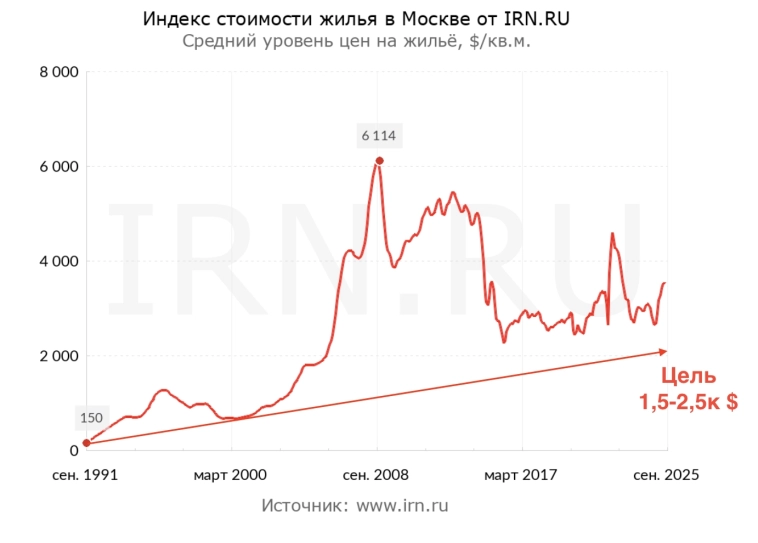 Байкал, очень правильный график. только я бы фокус делал бы не на пузыре 2008 года, когда за предыдущие 4 года цены в валюте выросли в 6 раз, а на периоде с 1991 по 2004 года. Это относительно спокойный и стабильный длительный период, который отражает реальную справедливую оценку стоимости недвижимости Москвы. Средняя стоимость квадрата в тот отрезок времени колебалась в районе 1-1,5тыс $ за квадрат. Накидываем сюда инфляцию в долларе за период 2005-2025 и получаем 1,5-2,5 тыс $ за квадрат. Текущий уровень согласно данным irn 3,5 тыс $, что говорит что мы еще не вернулись к справедливой стоимости метра в валюте.