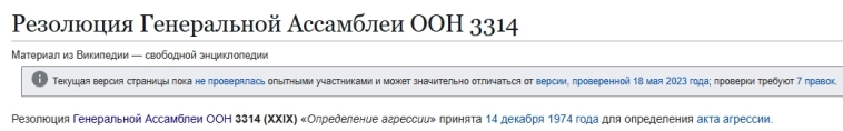Агрессией является применение вооруженной силы государством против суверенитета, территориальной неприкосновенности или политической независимости другого государства, или каким-либо другим образом, несовместимым с Уставом Организации Объединенных Наций, как это установлено в настоящем определении.