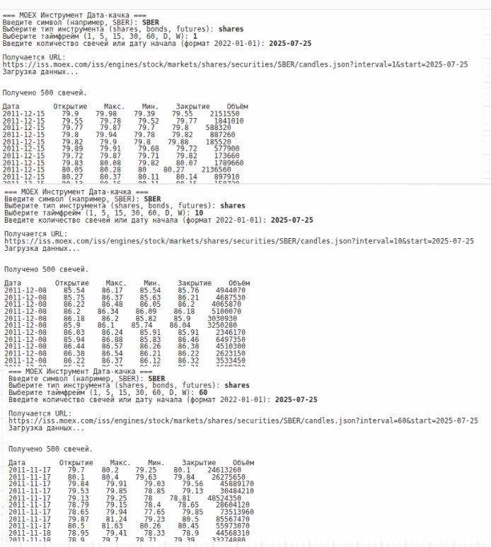 тут не допустимые коды ТФ. При работе с MOEX ISS API допустимо указывать следующие коды ТФ: