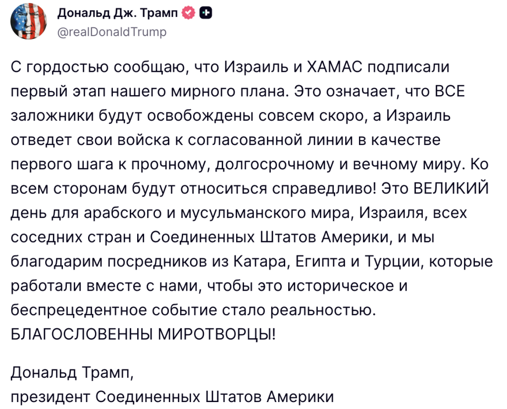 «Я с гордостью сообщаю, что Израиль и ХАМАС подписали первую фазу нашего мирного плана», — написал он в Truth Social.