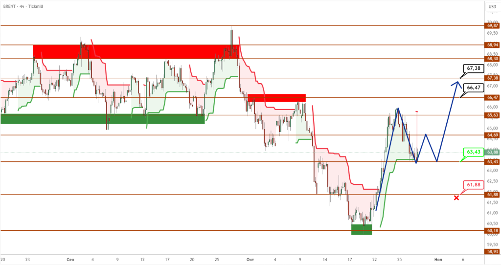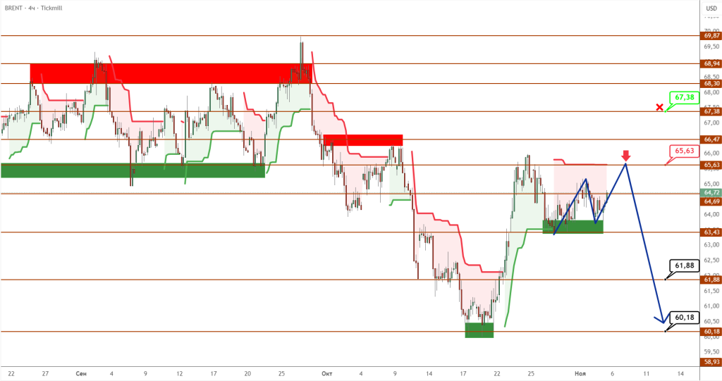 На фоне этих новостей можно предположить, что нефть перейдёт к боковому движению с потенциальным смещением вниз после завершения флэта. При попытке роста цена может столкнуться с серьёзным барьером на уровне 65,63 — именно там видится зона сопротивления с активным участием продавцов, что ограничивает возможности покупателей преодолеть её. В этом сценарии логичным развитием станет ретест данного уровня с последующим отскоком вниз, что откроет путь к диапазону между 61,88-60,18.