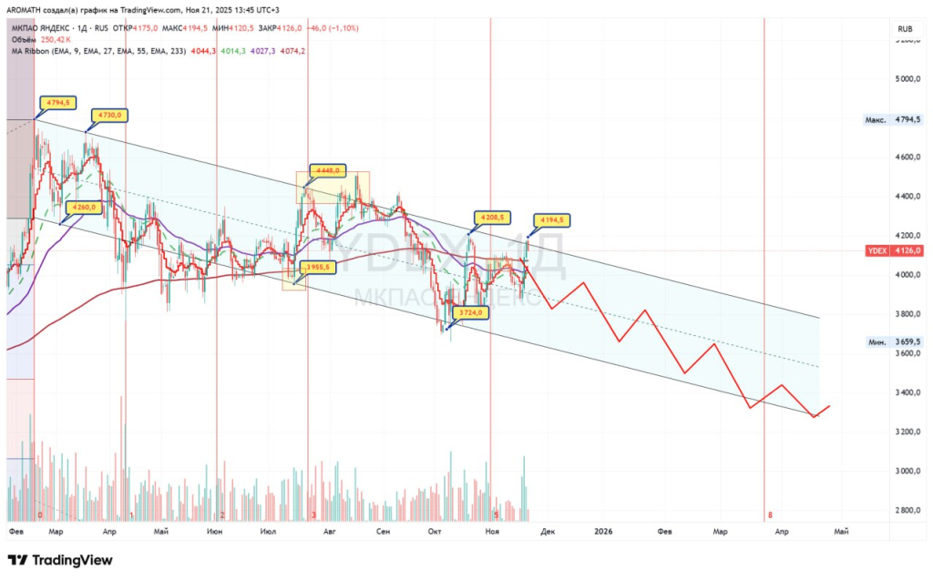 Лидер российского ИТ #YDEX Яндекс смотрит все равно вниз и едет ровно и строго в нисходящем канале 📉