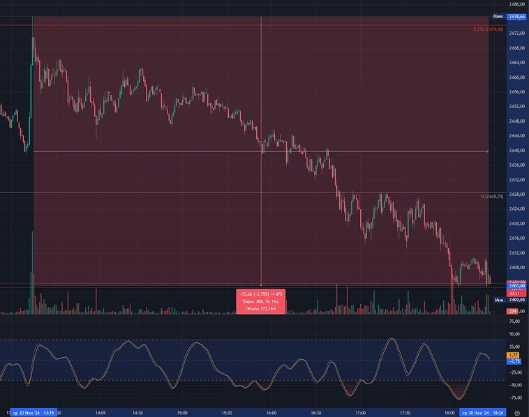 Весь рост, который произошел с победой Трампа на выборах, сошел на нет. Трамп-ралли началось 6 ноября и рост рынков продолжался до 11 ноября, индекс за это время вырос с 2616 до 2785 пунктов (+6,5%). Все ждали скорой реализации предвыборных обещаний Трампа, связанных с урегулированием конфликта на Украине.