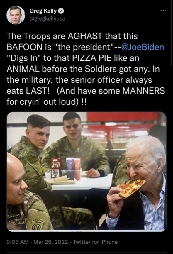 Байдена обвинили в том, что он начал первым «жрать пиццу как животное», хотя старшие офицеры всегда приступают к трапезе последними.