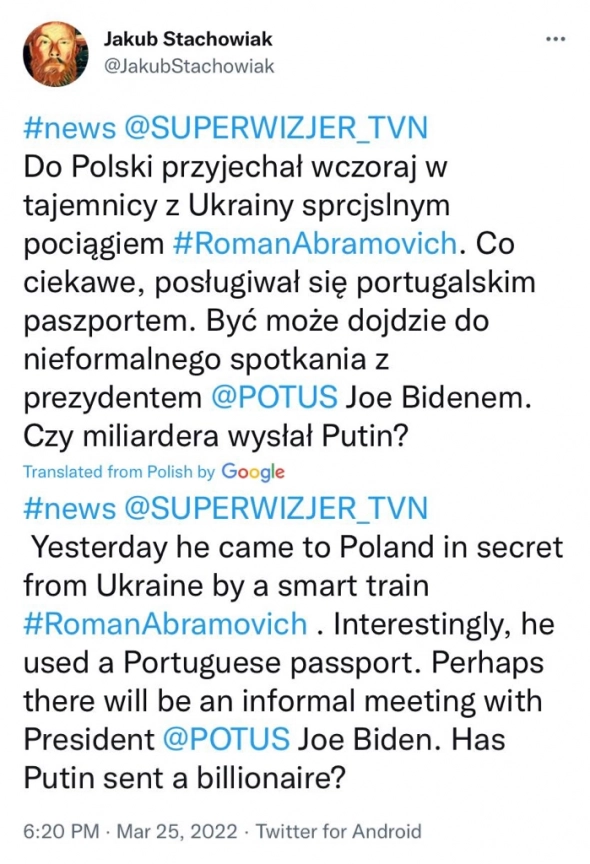 Польский журналист утверждает, что прошлой ночью Роман Абрамович прибыл в Польшу из Украины(!) на специальном поезде, и его поездка совпала с визитом Байдена в Польшу, с которым, возможно, он мог провести неформальную встречу. Для поездки он использовал португальский паспорт.